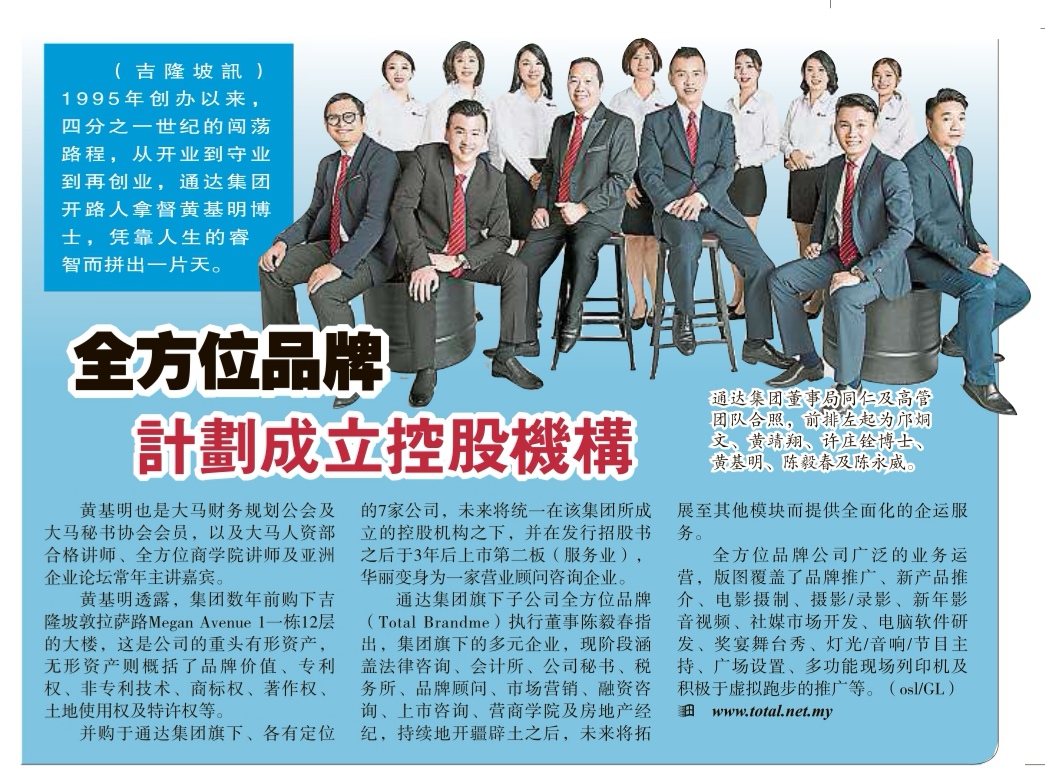 The Total Group is getting closer to realising our aim of becoming a one-stop Business Consultant Provider. We have recently announced plans to form a Holdings company, as a step to be public listed in 3 years time as a second board (service sector). Our expertise includes legal, finance and listed consultation; accounting, corporate secretarial, taxation, branding, marketing, consultation, and real estate services; as well as a business academy.