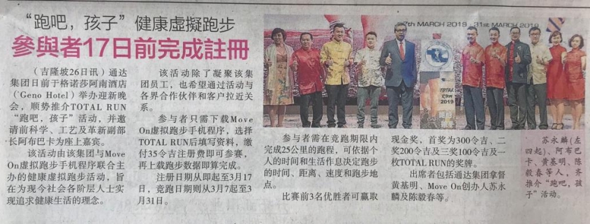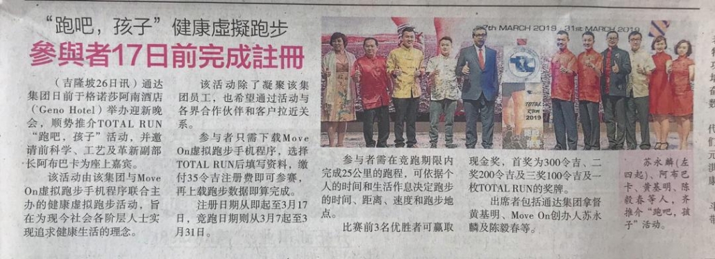 TOTAL virtual run was launched during TOTAL 2019 Chinese New Year Annual Dinner, in the presence of Ex Deputy Science, Technology and Innovation Minster, Abu Bakar Mohamad DIah. The run aims to unite Total Business Holdings staffs, valued clients and partners to engage in a healthy activity.